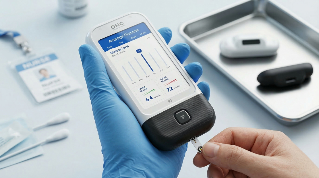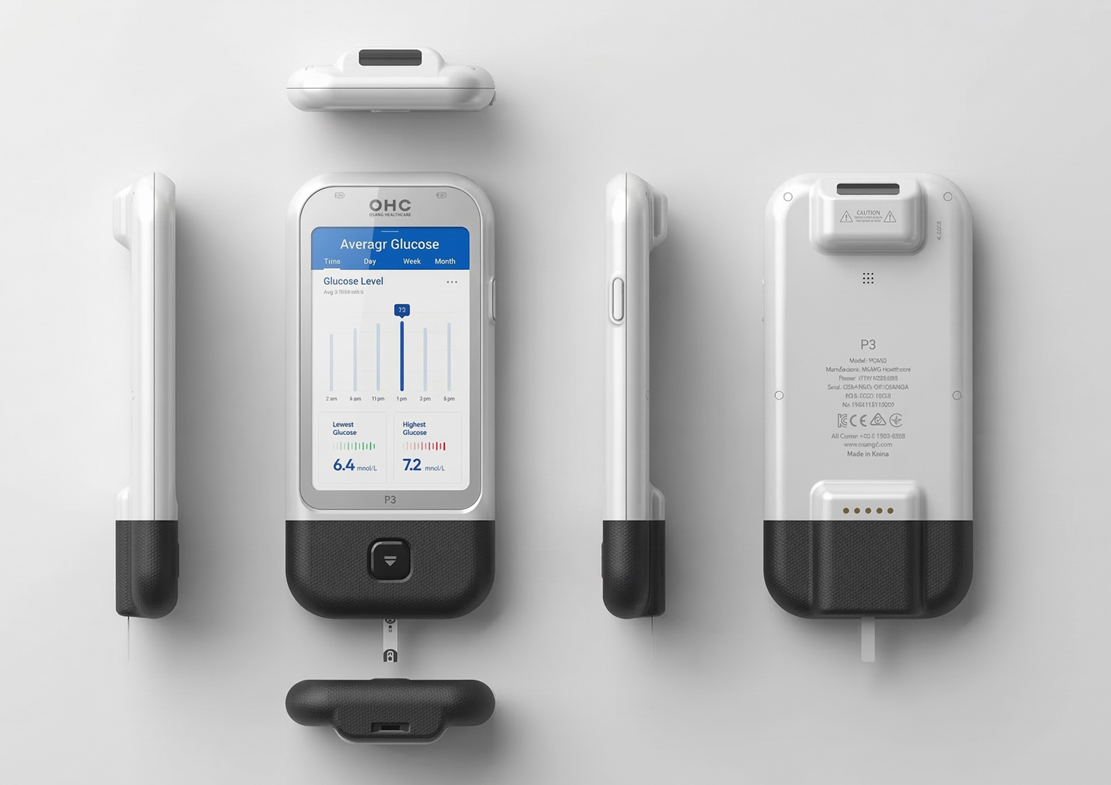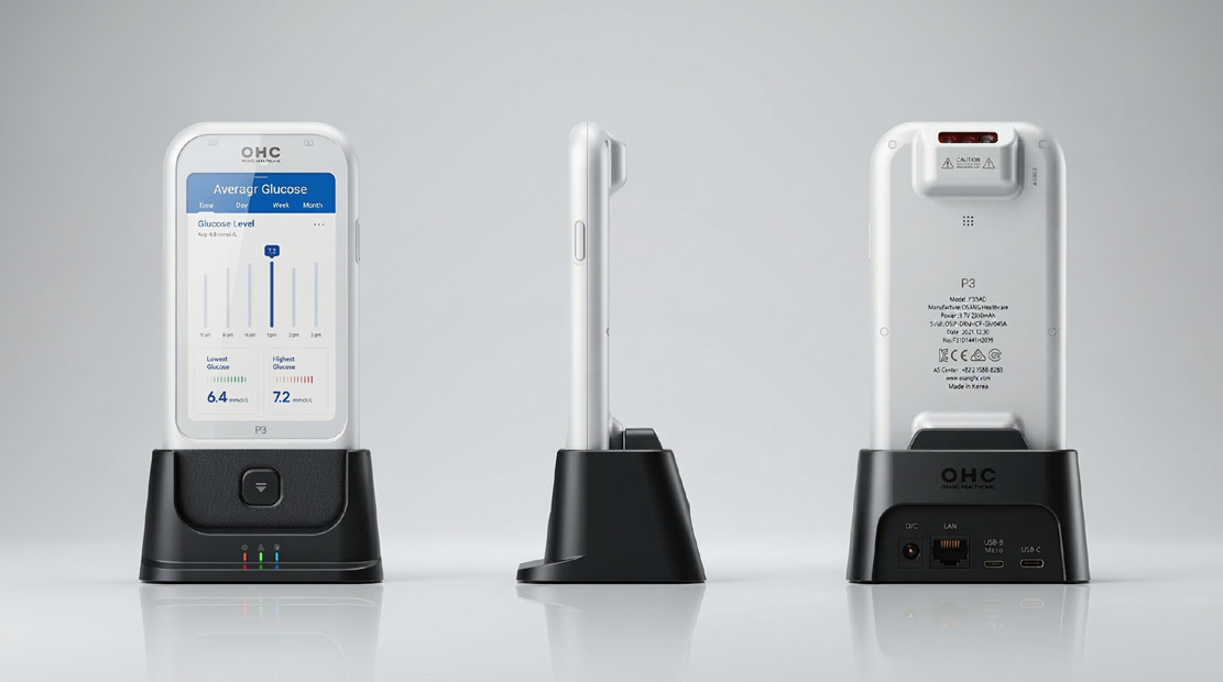 OHC 혈당측정기의 가장 두드러지는 특징 중 하나는 넓고 선명한 컬러 디스플레이 화면이다. 이 화면은 환자 또는 의료진이 혈당 수치를 한눈에 파악할 수 있도록 고안되었으며, 단순 수치 외에도 시간대별 그래프 시각화, 최고/최저 수치 강조, 주간 트렌드 분석 등의 기능을 직관적인 UI로 구현하고 있다. 사용자가 별도의 설명 없이도 기능을 인지할 수 있도록 구성된 이 UI는 **‘전문 의료기기이지만 누구나 쉽게 사용할 수 있는 제품’**이라는 핵심 컨셉을 구체화한 결과다.