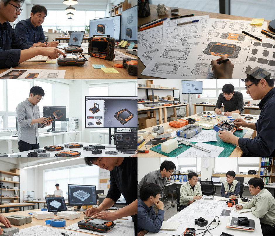 통신기와 초기 설정기는 그립감과 직관적 사용성을 고려해 보다 슬림하고 손에 잘 맞는 형태로 디자인되었습니다. 통신기의 측면은 고무 몰딩으로 마감되어 외부 충격에 강하며, 손에 쥐었을 때 안정적으로 고정되도록 설계되었습니다. 초기 설정기는 스마트 디바이스 기반의 UI를 갖추고 있으나, 일반적인 소비자용 모바일 기기와는 다른 견고한 외형을 지니고 있습니다. 거치대를 포함한 일체형 구조는 장시간 사용과 야외 환경에서의 안정적인 작동을 가능하게 합니다.