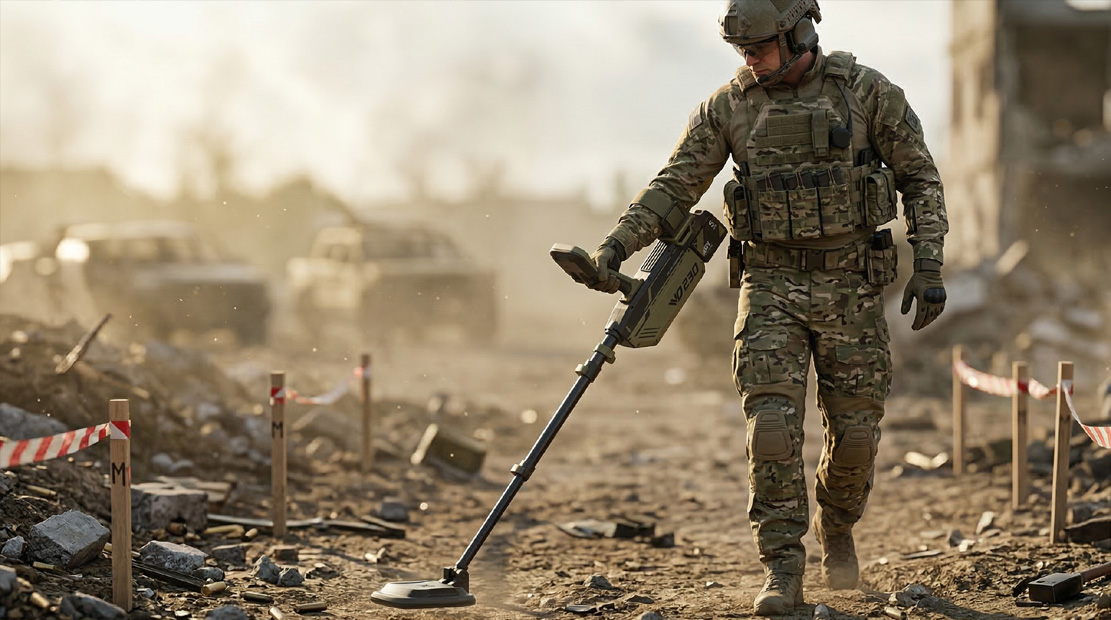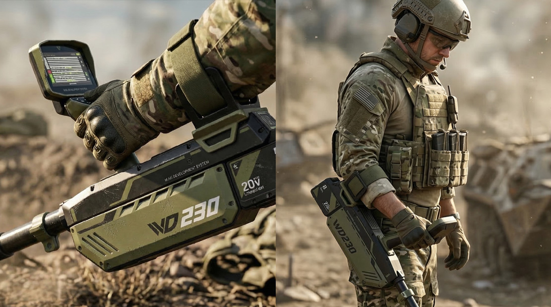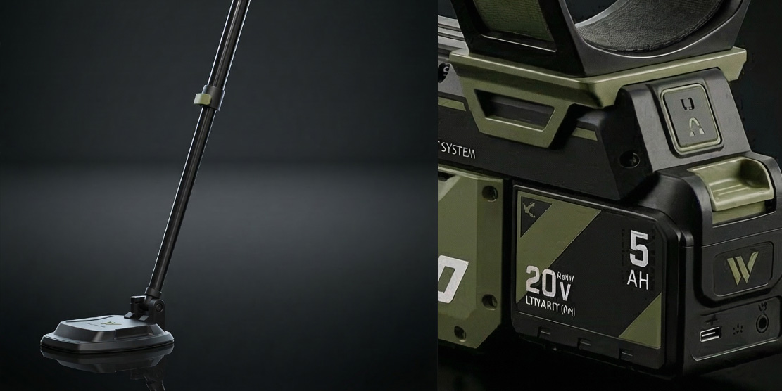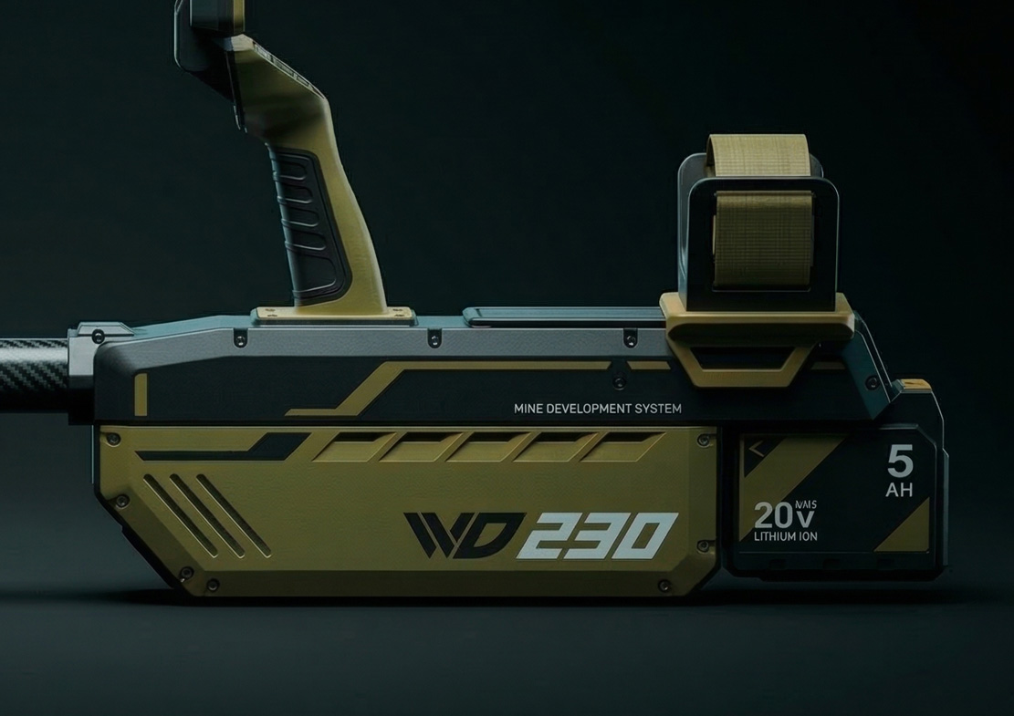 HOONSTUDIO에서 디자인한 이 지뢰탐지기는 단순한 기능성 장비의 범주를 넘어서, 미래지향적인 조형성과 직관적인 형태미를 갖춘 하나의 완성도 높은 산업 디자인 제품으로 완성되었습니다. 제품 전반에 걸쳐 관찰되는 디자인 언어는 강인함과 민첩함을 동시에 담고 있으며, 그 외형적 조형은 사용자가 한눈에 이 장비의 목적성과 신뢰성을 인지할 수 있도록 정제되어 있습니다.